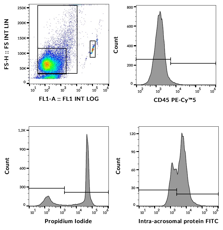 Flow cytometry analysis of human sperma using Sperm FlowEx Kit. Upper part represents analysis of sperm count by using fluorescent count beads standard and surface staining of human semen with anti-CD45 PE-Cy™5. Lower part represents staining of human sperms with PI (left) and anti-Intra acrosomal protein (Hs-8) FITC (right).