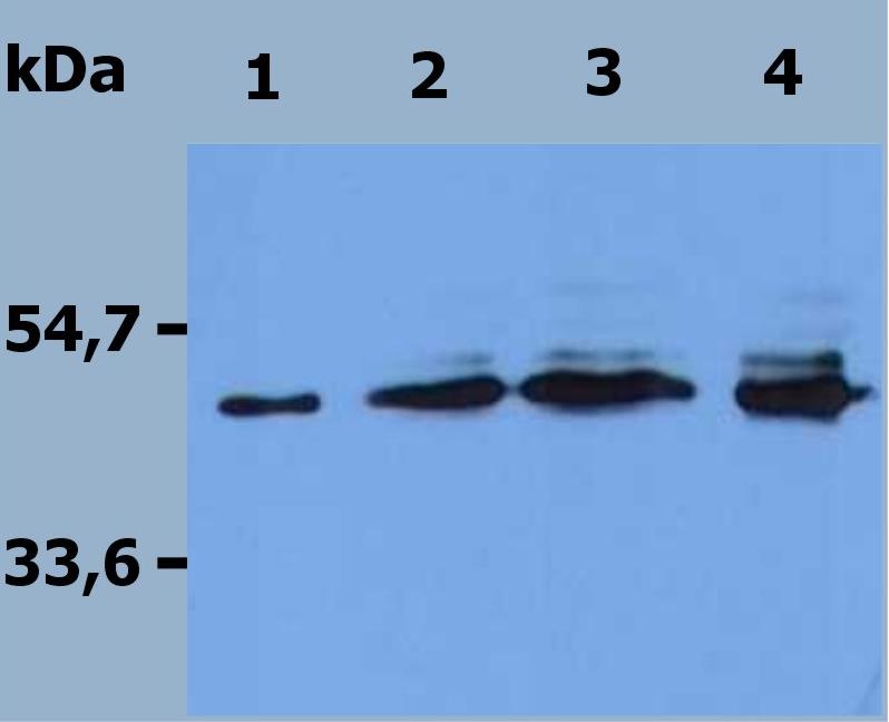 Western blotting of TRAIL-R2 (DR5) / Fc recombinant protein. Reducing conditions. Lane 1 to 4: immunostaining with TRAIL-R2 (DR5) specific antibody DR5-01 (Cat. No. 11-461-C100; dilution 2 μg/ml ). Detection with Goat anti mouse / HRP secondary antibody. Amount of TRAIL-R2 (DR5)/ Fc recombinant protein loaded on each lane: (1) 50 ng, (2) 100 ng, (3) 200 ng, (4) 500 ng.