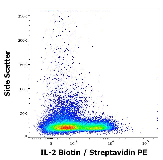 Flow cytometry intracellular staining pattern of PMA + Ionomycin stimulated and Brefeldin A treated human peripheral whole blood stained using anti-human IL-2 (35C3) Biotin antibody and secondary stained using Streptavidin PE (concentration in sample 1 μg/ml).