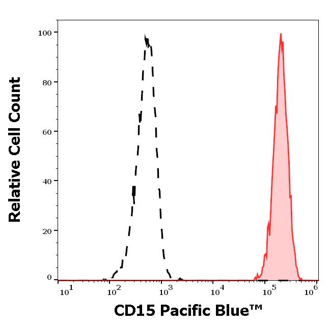 Separation of human neutrophil granulocytes (red-filled) from CD15 negative lymphocytes (black-dashed) in flow cytometry analysis (surface staining) of human peripheral whole blood stained using anti-human CD15 (MEM-158) Pacific Blue™ antibody (4 μl reagent / 100 μl of peripheral whole blood).