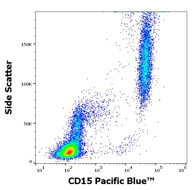 Flow cytometry surface staining pattern of human peripheral whole blood stained using anti-human CD15 (MEM-158) Pacific Blue™ antibody (4 μl reagent / 100 μl of peripheral whole blood).