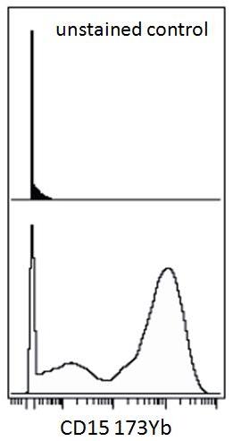 Mass cytometry (surface staining) of human peripheral blood cells (after ammonium chloride red blood cell lysis) with anti-human CD15 (MEM-158) 173Yb. Gated on singlets.