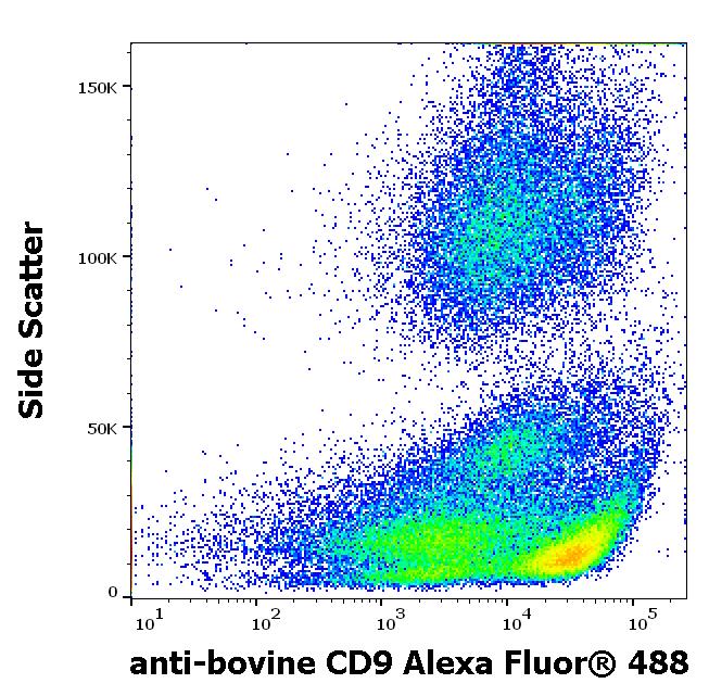 Flow cytometry surface staining pattern of bovine peripheral whole blood stained using anti-bovine CD9 (IVA50) Alexa Fluor® 488 antibody (concentration in sample 10 μg/ml).
