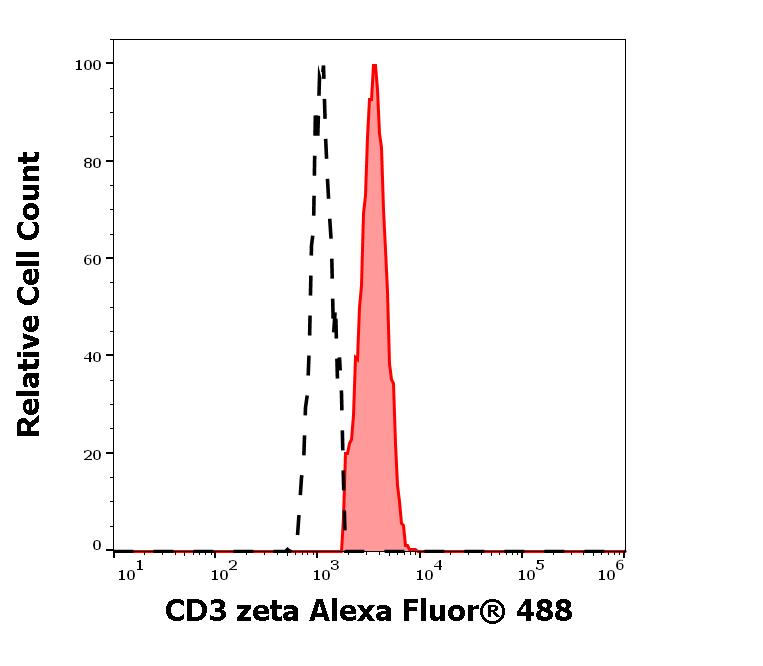 Separation of human CD3 zeta positive CD3 positive T cells (red-filled) from CD3 zeta negative CD3 negative lymphocytes (black-dashed) in flow cytometry analysis (intracellular staining) of human peripheral whole blood stained using anti-human CD3 zeta (H146-968) Alexa Fluor® 488 antibody (concentration in sample 9 μg/ml).