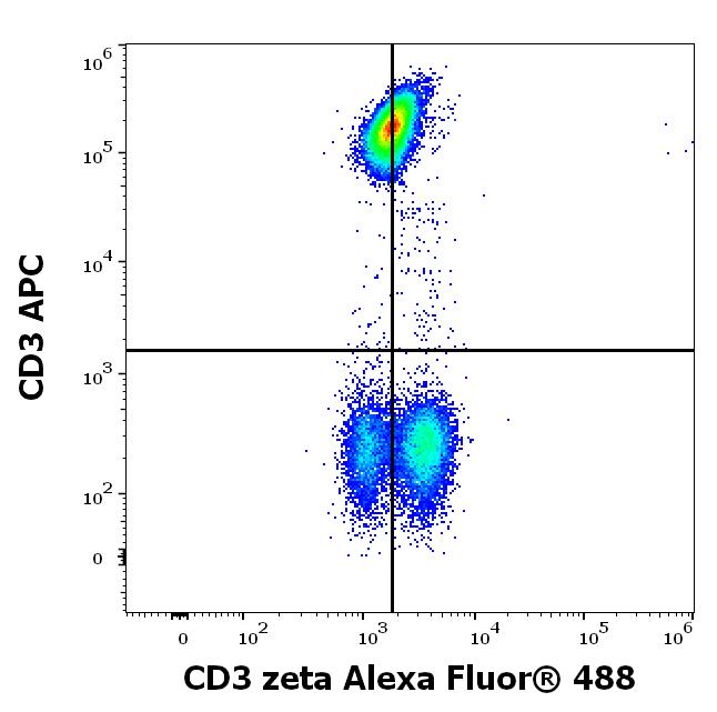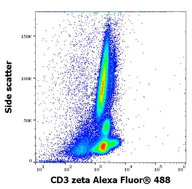 Flow cytometry intracellular staining pattern of human peripheral whole blood stained using anti-human CD3 zeta (H146-968) Alexa Fluor® 488 antibody (concentration in sample 9 μg/ml).