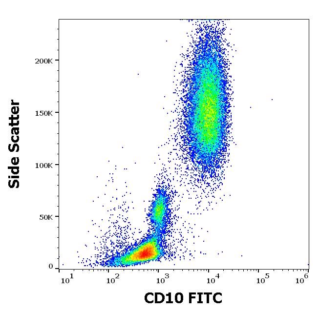 Flow cytometry surface staining pattern of human peripheral whole blood stained using anti-human CD10 (MEM-78) FITC antibody (20 μl reagent / 100 μl of peripheral whole blood).