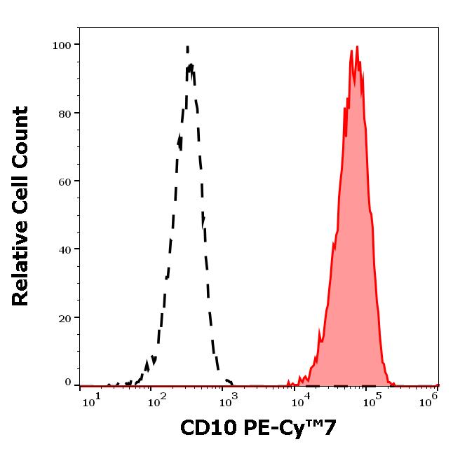 Separation of human neutrophil granulocytes (red-filled) from 10 negative lymphocytes (black-dashed) in flow cytometry analysis (surface staining) of human peripheral whole blood stained using anti-human CD10 (MEM-78) PE-Cy™7 antibody (4 μl reagent / 100 μl of peripheral whole blood).