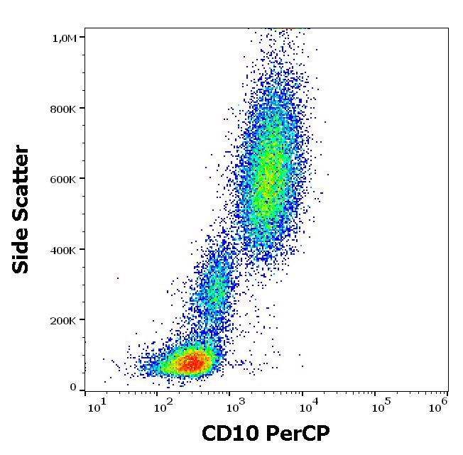 Flow cytometry surface staining pattern of human peripheral whole blood stained using anti-human CD10 (MEM-78) PerCP antibody (10 μl reagent / 100 μl of peripheral whole blood).