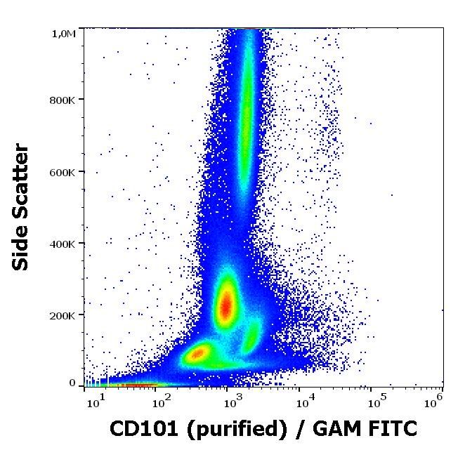Flow cytometry surface staining pattern of human peripheral whole blood stained using anti-human CD101 (BB27) purified antibody (concentration in sample 0,56 μg/ml, GAM FITC).