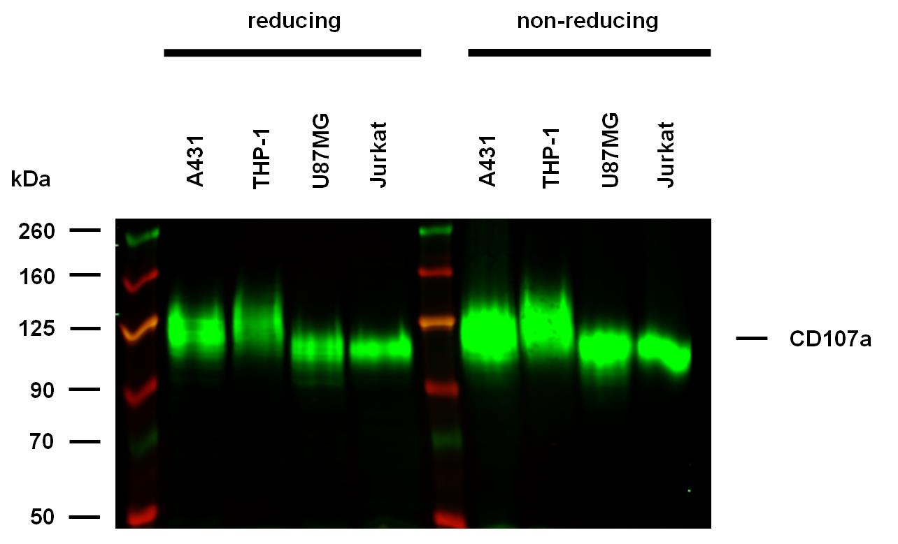Anti-Hu CD107a Purified (clone H4A3) works in WB application under reducing and non-reducing conditions.