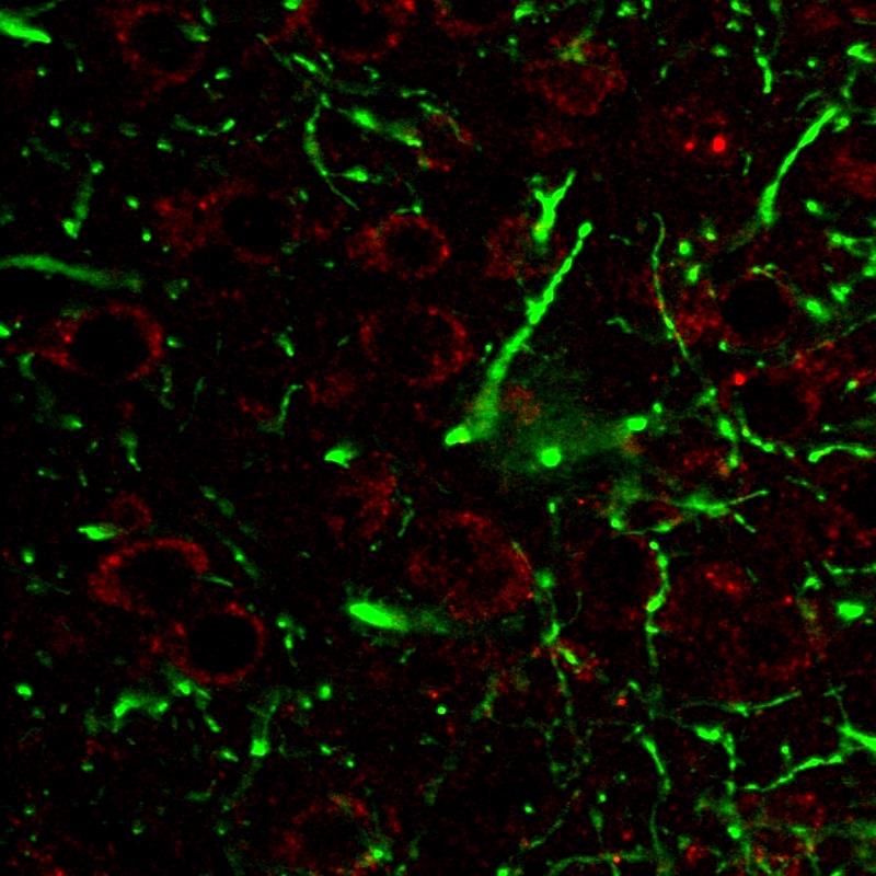 Immunohistochemistry staining of CD107a (red) in tissue sections of murine brain expressing GFP in some of its neurons (green). Mouse monoclonal antibody H4A3 (anti-CD107a) was detected with goat anti-mouse IgG1 conjugated with Alexa Fluor 555.