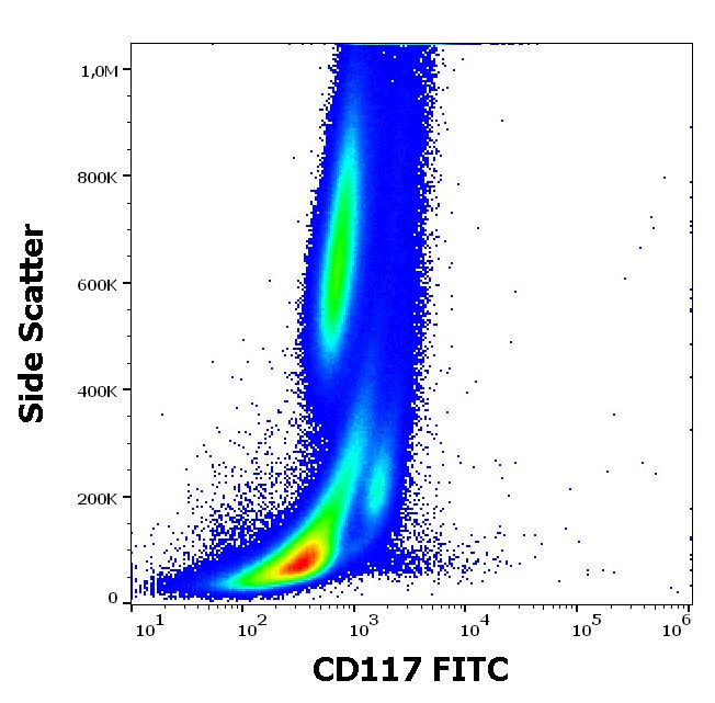 Flow cytometry surface staining pattern of human peripheral whole blood stained using anti-human CD117 (104D2) FITC antibody (20 μl reagent / 100 μl of peripheral whole blood).