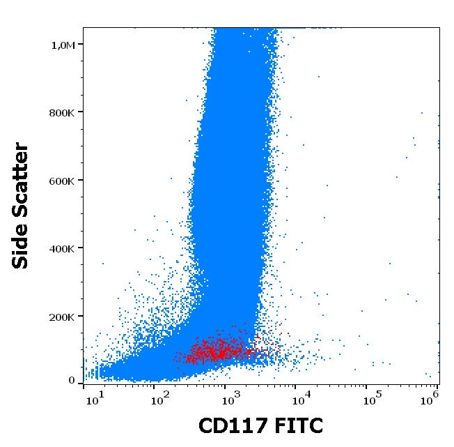 Flow cytometry surface staining pattern of human peripheral whole blood showing CD34 positive stem cells (red) stained using anti-human CD117 (104D2) FITC antibody (20 μl reagent / 100 μl of peripheral whole blood).