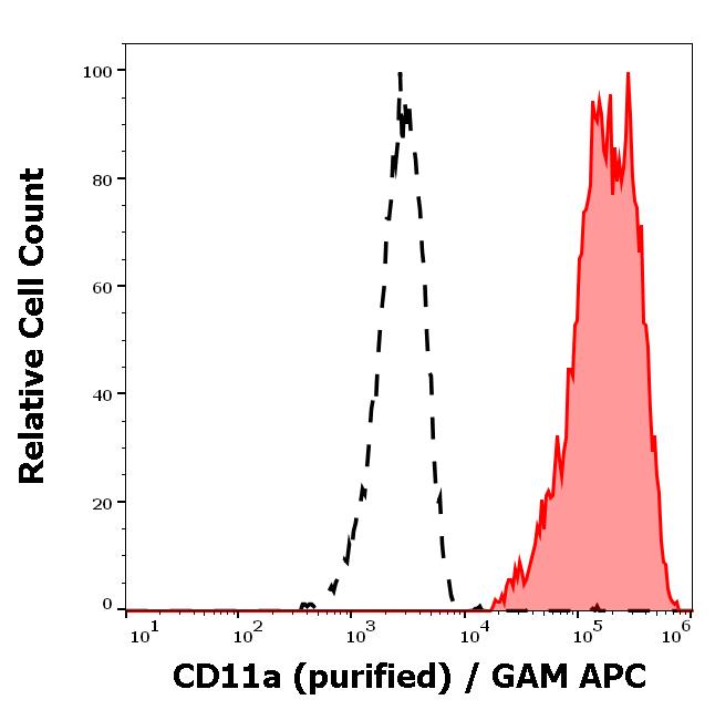 Separation of human CD11a positive lymphocytes (red-filled) from CD11a negative blood debris (black-dashed) in flow cytometry analysis (surface staining) of human peripheral whole blood stained using anti-human CD11a (MEM-83) purified antibody (concentration in sample 1 μg/ml) GAM APC.