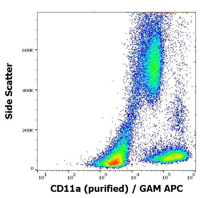 Flow cytometry surface staining pattern of human peripheral blood cells stained using anti-human CD11a (MEM-83) purified antibody (concentration in sample 1 μg/ml) GAM APC.