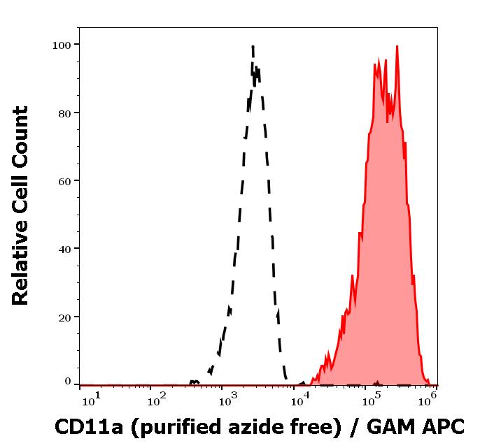 Separation of human CD11a positive lymphocytes (red-filled) from CD11a negative blood debris (black-dashed) in flow cytometry analysis (surface staining) of human peripheral whole blood stained using anti-human CD11a (MEM-83) purified antibody (azide free, concentration in sample 1 μg/ml) GAM APC.