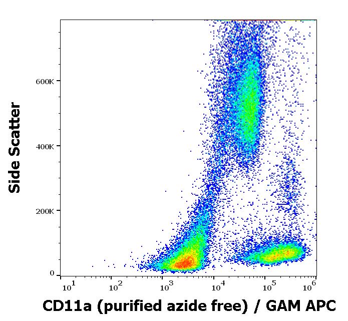 Flow cytometry surface staining pattern of human peripheral blood cells stained using anti-human CD11a (MEM-83) purified antibody (azide free, concentration in sample 1 μg/ml) GAM APC.