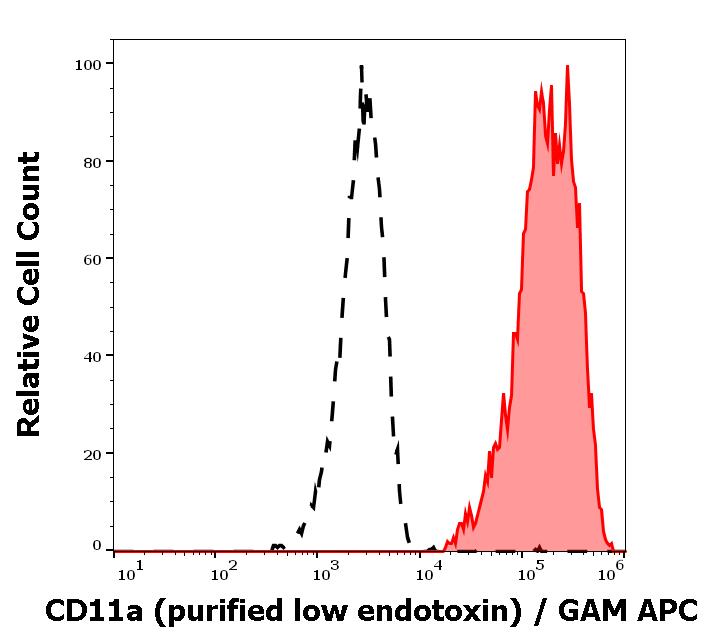 Separation of human CD11a positive lymphocytes (red-filled) from CD11a negative blood debris (black-dashed) in flow cytometry analysis (surface staining) of human peripheral whole blood stained using anti-human CD11a (MEM-83) purified antibody (low endotoxin, concentration in sample 1 μg/ml) GAM APC.