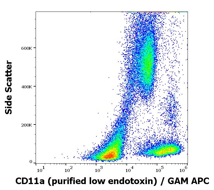 Flow cytometry surface staining pattern of human peripheral blood cells stained using anti-human CD11a (MEM-83) purified antibody (low endotoxin, concentration in sample 1 μg/ml) GAM APC.