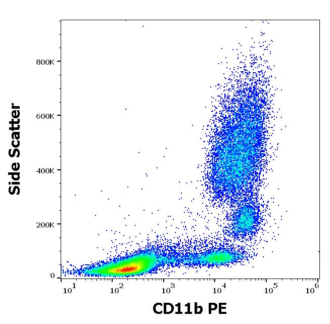 Flow cytometry surface staining pattern of human peripheral whole blood stained using anti-human CD11b (MEM-174) PE antibody (20 μl reagent / 100 μl of peripheral whole blood).