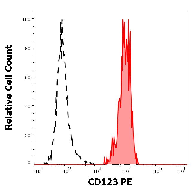 Separation of human CD123 positive Basophil granulocytes(red-filled) from neutrophil granulocytes (black-dashed) in flow cytometry analysis (surface staining) of human peripheral whole blood stained using anti-human CD123 (6H6) PE antibody (10 μl reagent / 100 μl of peripheral whole blood).