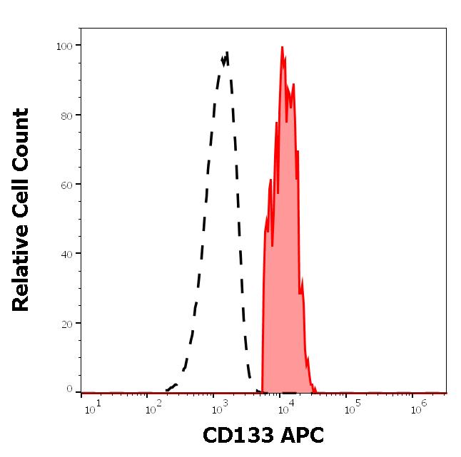 Separation of human CD133 positive CD34 positive stem cells (red-filled) from CD133 negative CD34 negative cells (black-dashed) in flow cytometry analysis (surface staining) of human bone marrow cells stained using anti-human CD133 (W6B3C1) APC antibody (10 μl reagent per milion cells in 100 μl of cell suspension).