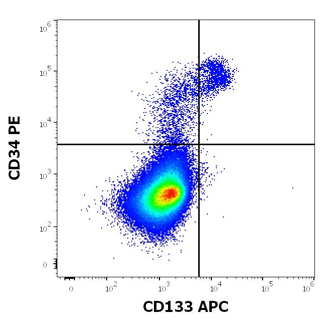 Flow cytometry multicolor surface staining of human bone marrow cells stained using anti-human CD133 (W6B3C1) APC antibody (10 μl reagent per milion cells in 100 μl of cell suspension) and anti-human CD34 (581) PE antibody (20 μl reagent per milion cells in 100 μl of cell suspension).