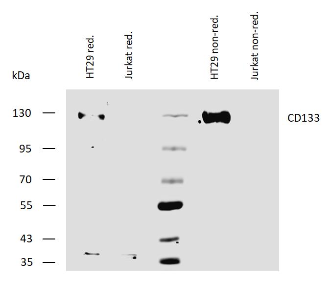 Western blotting analysis of human CD133 using mouse monoclonal antibody W6B3C1 on lysates of HT29 cells and Jurkat cells (negative control) under reducing and non-reducing conditions. Nitrocellulose membrane was probed with 2 µg/ml of mouse monoclonal antibody followed by IRDye800-conjugated anti-mouse secondary antibody. CD133 was detected around 125 kDa.