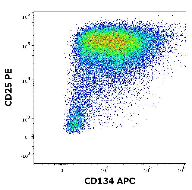 Flow cytometry multicolor surface staining of human PHA stimulated peripheral blood mononuclear cells stained using anti-human CD134 (Ber-ACT35) APC antibody (10 μl reagent per milion cells in 100 μl of cell suspension) and anti-human CD25 (MEM-181) PE antibody (20 μl reagent / 100 μl of peripheral whole blood).