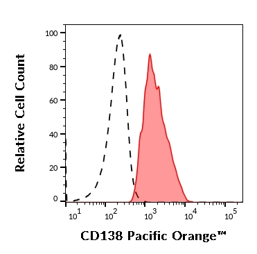 Separation of anti-human CD138 positive plasma cells (red-filled) from anti-human CD138 negative neutrophil granulocytes (black-dashed) in flow cytometry analysis (surface staining) of human bone marrow of a patient with multiple myeloma stained using anti-human CD138 (MI15) Pacific Orange™.