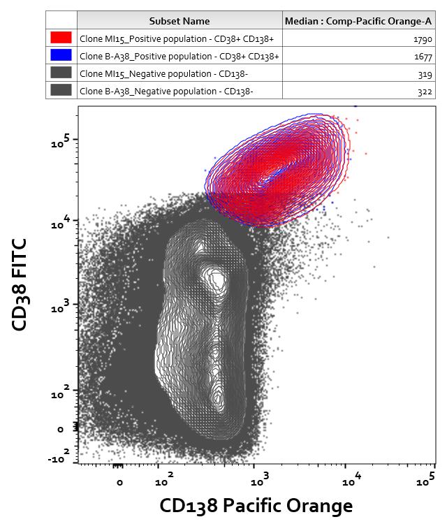 Comparison of CD138 (B-A38) Pacific Orange™ signal and CD138 (MI15) Pacific Orange™ signal on human bone marrow of a patient with multiple myeloma (flow cytometry, surface staining).
