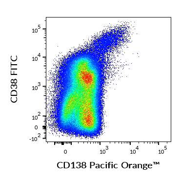 Flow cytometry multicolor surface staining of human bone marrow mononuclear cells from human bone marrow of a patient with multiple myeloma using anti-human CD38 (HIT2) FITC and anti-human CD138 (MI15) Pacific Orange™.