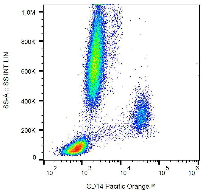 Flow cytometry analysis (surface staining) of human peripheral blood cells with anti-human CD14 (MEM-15) Pacific Orange™.