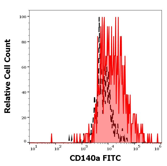 Separation of cells stained using anti-human CD140a (16A1) FITC antibody (4 μl reagent per million cells in 100 μl of cell suspension, red-filled) from cells stained using mouse IgG1 isotype control (MOPC-21) FITC antibody (concentration in sample 3 μg/ml, same as CD140a FITC concentration, black-dashed) in flow cytometry analysis (surface staining) of PDGF-RA transfected cells.