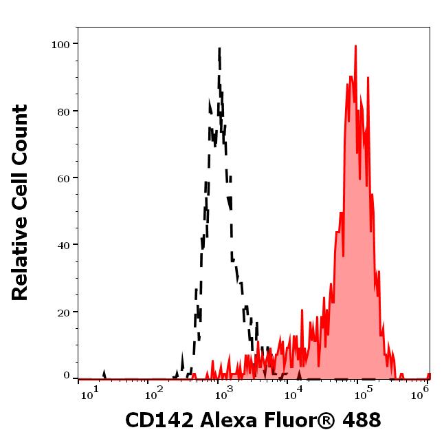 Separation of A431 cells stained using anti-human CD142 (HTF-1) Alexa Fluor® 488 antibody (4 μl reagent per milion cells in 100 μl of cell suspension, red-filled) from A431 cells stained using mouse IgG1 isotype control (MOPC-21) Alexa Fluor® 488 antibody (concentration in sample 9 μg/ml, same as CD142 Alexa Fluor® 488 concentration, black-dashed) in flow cytometry analysis (surface staining).