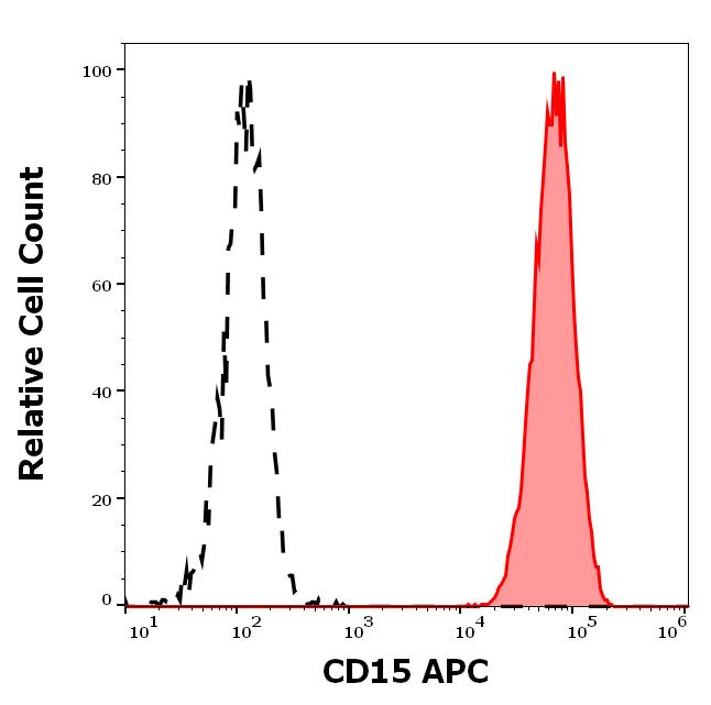 Separation of human neutrophil granulocytes (red-filled) from lymphocytes (black-dashed) in flow cytometry analysis (surface staining) of human peripheral whole blood stained using anti-human CD15 (W6D3) APC antibody (10 μl reagent / 100 μl of peripheral whole blood).