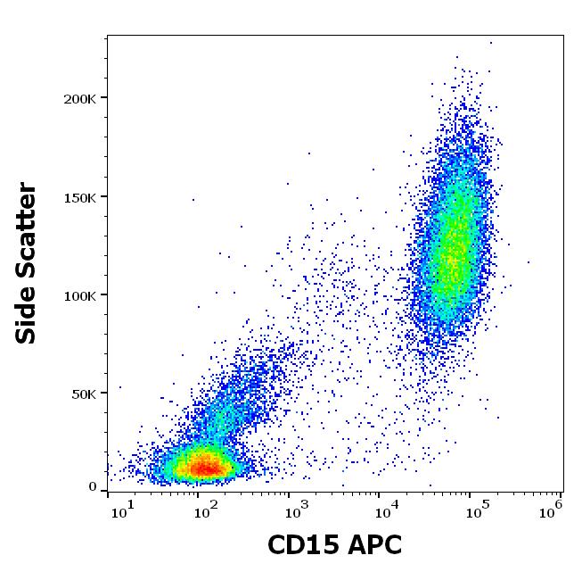 Flow cytometry surface staining pattern of human peripheral whole blood stained using anti-human CD15 (W6D3) APC antibody (10 μl reagent / 100 μl of peripheral whole blood).