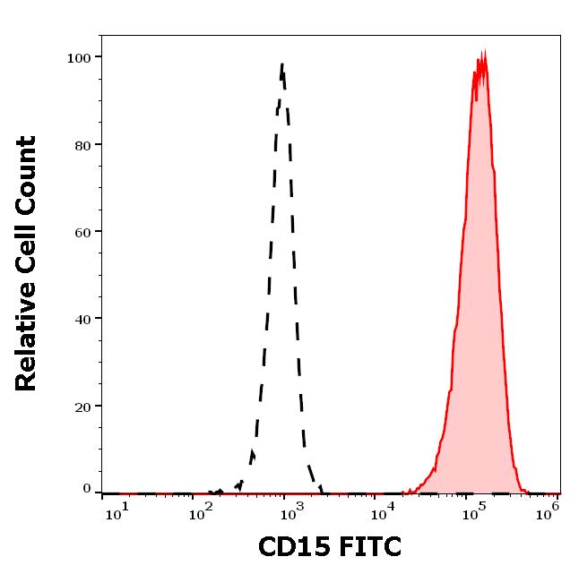 Separation of human CD15 positive neutrophil granulocytes (red-filled) from lymphocytes (black-dashed) in flow cytometry analysis (surface staining) of human peripheral whole blood stained using anti-human CD15 (W6D3) FITC antibody (4 μl reagent / 100 μl of peripheral whole blood).