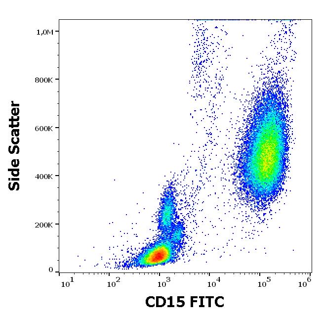Flow cytometry surface staining pattern of human peripheral whole blood stained using anti-human CD15 (W6D3) FITC antibody (4 μl reagent / 100 μl of peripheral whole blood).