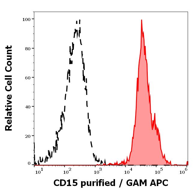 Separation of human neutrophil granulocytes (red-filled) from lymphocytes (black-dashed) in flow cytometry analysis (surface staining) of human peripheral whole blood stained using anti-human CD15 (MMA) purified antibody (concentration in sample 0.56 μg/ml) GAM APC.