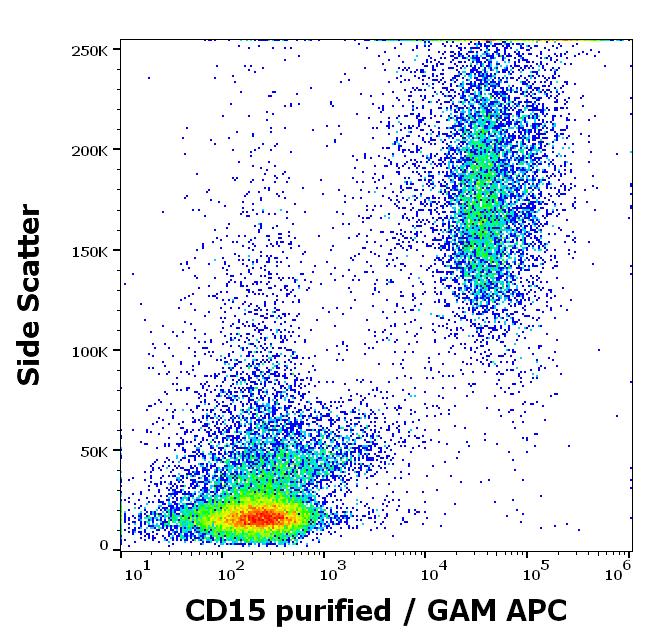 Flow cytometry surface staining pattern of human peripheral whole blood stained using anti-human CD15 (MMA) purified antibody (concentration in sample 0.56 μg/ml) GAM APC.