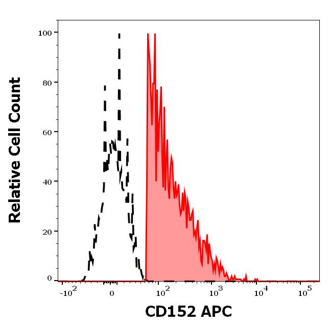 Separation of human CD152 positive CD3 positive lymphocytes (red-filled) from CD152 negative CD3 negative lymphocytes (black-dashed) in flow cytometry analysis (surface staining) of human peripheral whole blood stained using anti-human CD152 (BNI3) APC antibody (10 μl reagent / 100 μl of peripheral whole blood).