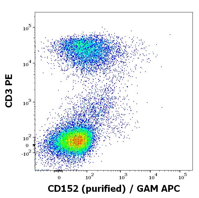 Flow cytometry multicolor surface staining of human PHA stimulated lymphocytes stained using anti-human CD152 (BNI3) purified antibody (concentration in sample 10 µg/ml, GAM APC) and anti-human CD3 (UCHT1) PE antibody (20 μl reagent / 100 μl of peripheral whole blood).