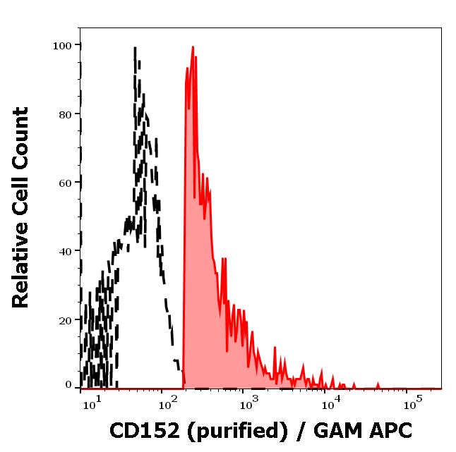 Separation of human CD152 positive CD3 positive lymphocytes (red-filled) from CD152 negative CD3 negative lymphocytes (black-dashed) in flow cytometry analysis (surface staining) of human peripheral whole blood stained using anti-human CD152 (BNI3) purified antibody (concentration in sample 10 µg/ml) GAM APC.