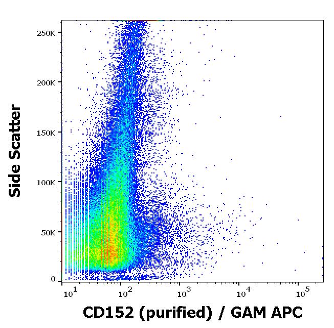 Flow cytometry surface staining pattern of human PHA stimulated peripheral whole blood stained using anti-human CD152 (BNI3) purified antibody (concentration in sample 10 µg/ml) GAM APC.