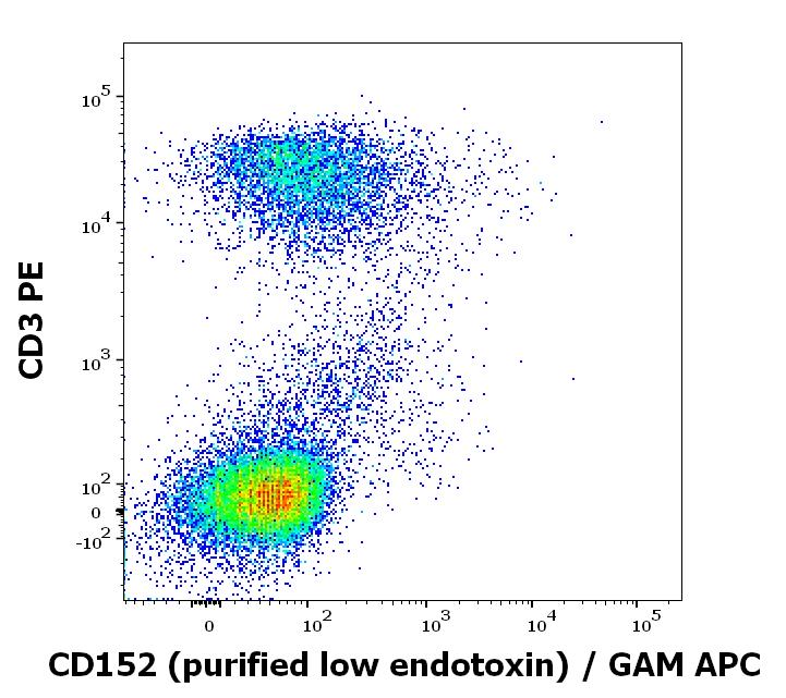 Flow cytometry multicolor surface staining of human PHA stimulated lymphocytes stained using anti-human CD152 (BNI3) purified antibody (low endotoxin, concentration in sample 10 µg/ml, GAM APC) and anti-human CD3 (UCHT1) PE antibody (20 μl reagent / 100 μl of peripheral whole blood).