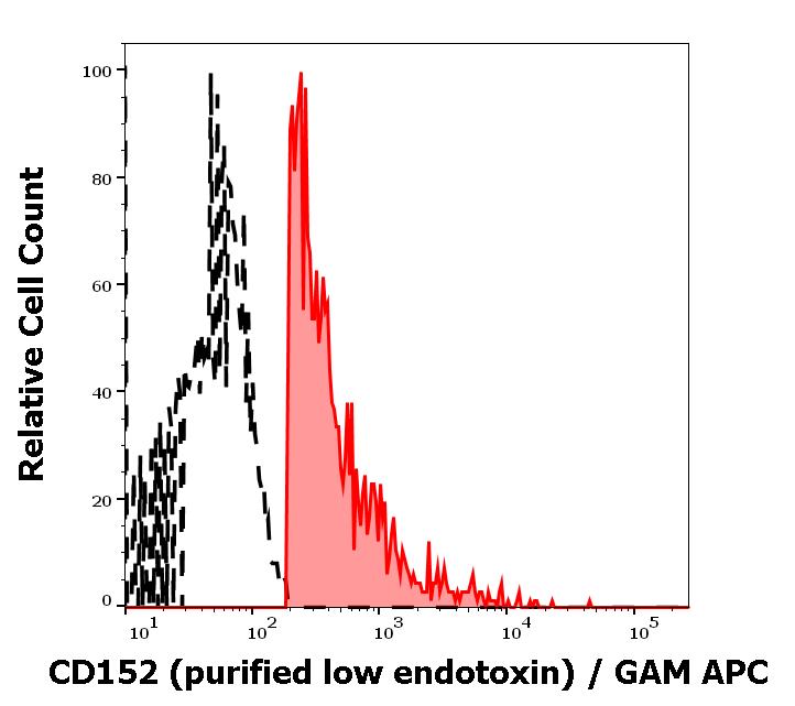 Separation of human CD152 positive CD3 positive lymphocytes (red-filled) from CD152 negative CD3 negative lymphocytes (black-dashed) in flow cytometry analysis (surface staining) of human peripheral whole blood stained using anti-human CD152 (BNI3) purified antibody (low endotoxin, concentration in sample 10 µg/ml) GAM APC.