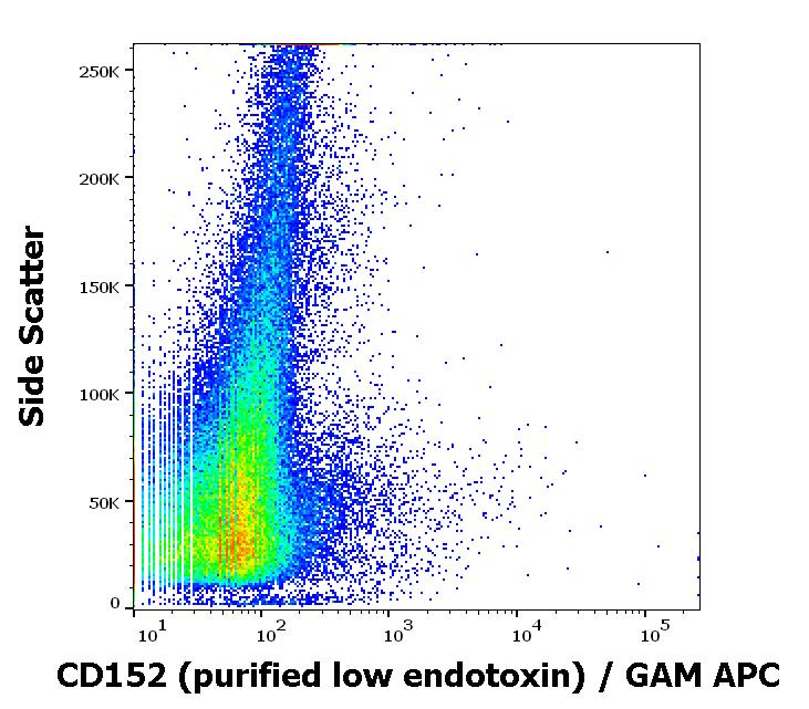 Flow cytometry surface staining pattern of human PHA stimulated peripheral whole blood stained using anti-human CD152 (BNI3) purified antibody (low endotoxin, concentration in sample 10 µg/ml) GAM APC.