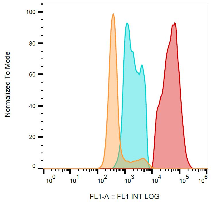Flow cytometry detection of CD154 / CD40L in IgE-activated human peripheral blood with anti-CD154 / CD40L (24-31) FITC. Orange = blank, blue = CD154 negative cells, red = CD154 positive cells.