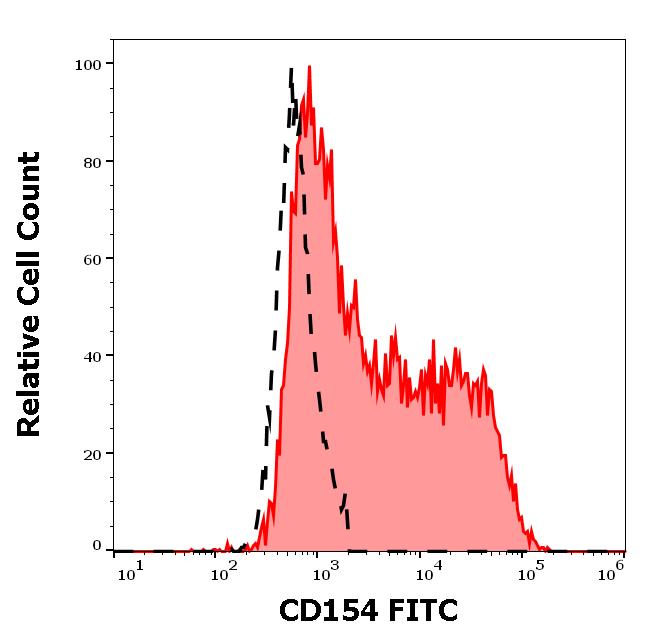 Separation of PMA/Ionomycine activated PBMCs stained using anti-human CD154 (24-31) FITC antibody (4 μl reagent per million cells in 100 μl of cell suspension, red-filled) from PMA/Ionomycine activated PBMCs stained using mouse IgG1 isotype control (MOPC-21) FITC antibody (concentration in sample 3 μg/ml, same as CD154 FITC concentration, black-dashed) in flow cytometry analysis (surface staining) of PMA/Ionomycine activated PBMCs.